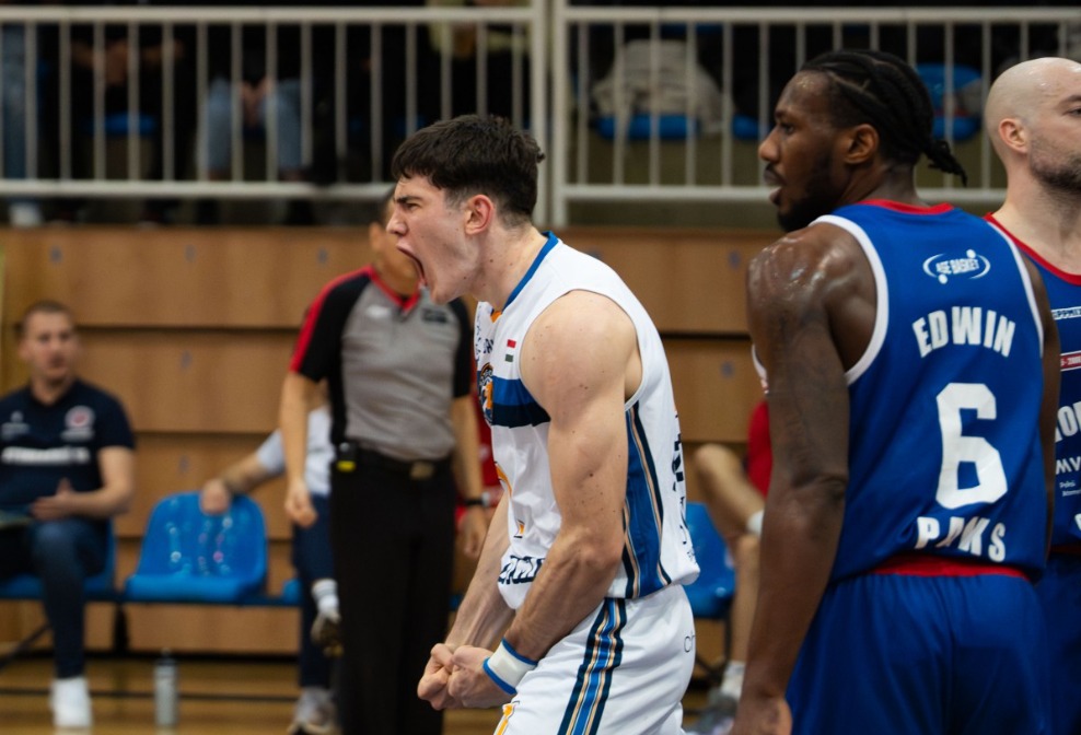 Grimesé volt az első találat, Csarapics két büntetővel tette fel az eredményjelzőre a házigazdát, Ivosev a plusz egyet rontotta el. Durmo egy triplával kezdte meg a pontgyártást, Meleg csatlakozott mellé, Grimes dobta át Mezőfit (7-6). Durmo ezúttal a sarokból egy középtávolit süllyesztett el, Matthias Zollner három pontos hátrányban kért időt, Csarapics ezúttal csak egy büntetőt tudott bedobni. Grimes kettesére 2+1-es akció jött válaszul Melegtől, Durmo zsákolásával és Lukácsi triplájával 10 pontra hízott az NKA előnye, Ferencz lépett fel a Körmendből (18-10). Meleg egy technikai miatt dobhatott büntetőt, az utolsó két perchez érkezve pedig már 13 egység választotta el a feleket, ez pedig a maradék időben még tovább nőtt. 30-15