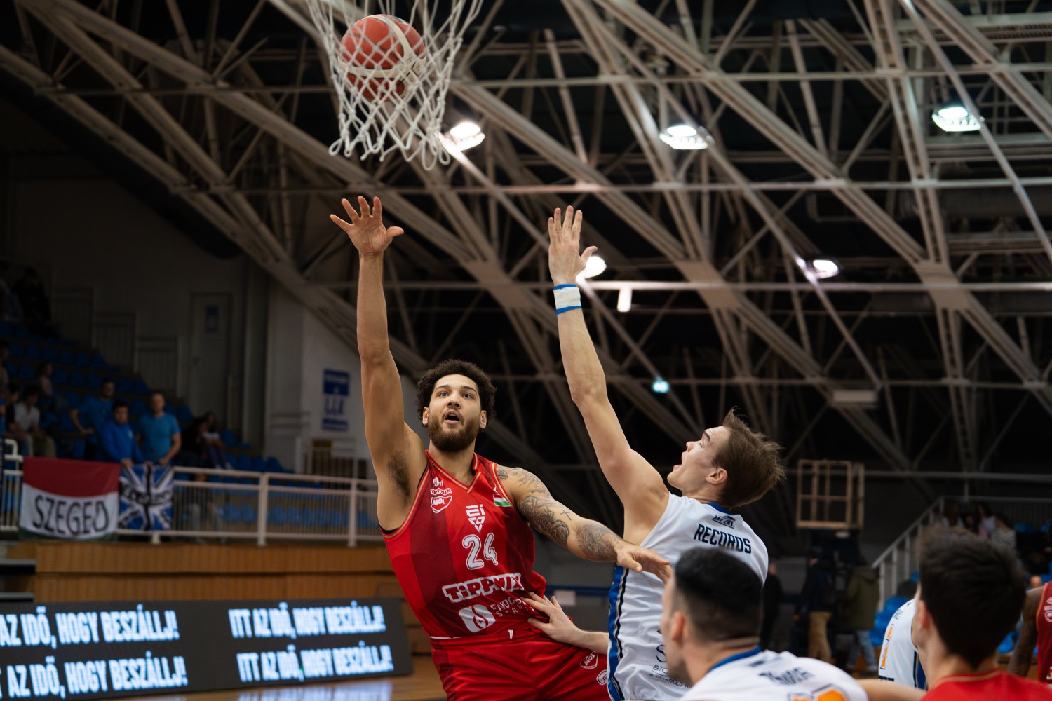 Egy támadólepattanót követően egyenlített a Honvéd Simmons találatával, a vendég csapat lendülete pedig nem, hogy csak nem tört meg a két negyed között, de Simmons zsákolását követően már 23-27 állt az eredményjelzőn. Records egy pontot szerzett, Simmons újabb kettőt, Mucza köszönt be volt csapata ellen. Simmons ezúttal egy büntetőt dobott be, Rush ismét megvillant, Vulikicstól jött a felelet. Dimitrijevics büntetői célt értek, Rush közelije után ismét időt kért a Szeged (28-36). Ez nem zavarta meg a piros-fehérek párosát, hiszen újabb öt pontot szállítottak sorozatban, Vulikics volt az ismét, aki próbált lendíteni a hazaiak támadójátékán. Rush duplájára ezúttal Moss felelt egy triplával, a félidőben végül 35-46 volt az állás, Rush és Simmons 31 pontot rámolt be az első 20 percben.