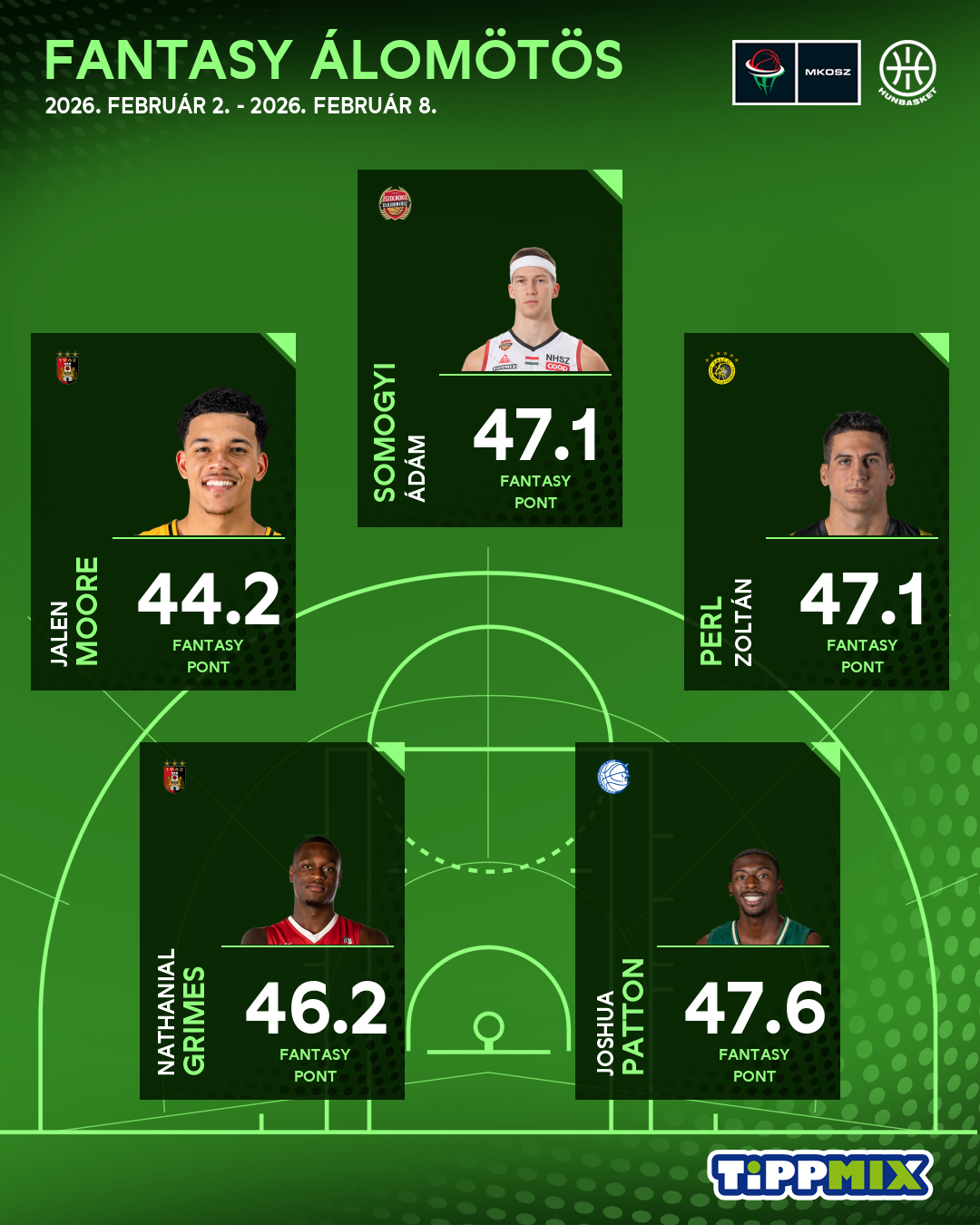 Az álomcsapat negyedik és ötödik helyére két körmendi játékos érkezett be csapatuk szegedi veresége ellenére is: Nathanial Grimeson (28 pont, 11 pattanó, 2-2 gólpassz és blokk, 4 eladott labda, 46.2 fantasy pont) és Jalen Moore-on (29 pont, 1 lepattanó, 6 gólpassz, 3 szerzett és 4 eladott labda, 44.2 fantasy pont) sem múlott, hogy a vasiak végül nem tudták győztesen elhagyni a pályát.
