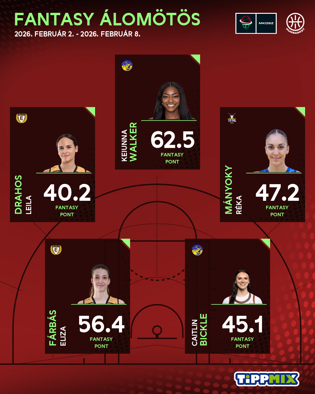 A TFSE-MTK kikapott a Sopron Baskettől, Mányoky Réka ennek ellenére is nagyon sok pontot hozott azoknak, akik beválogatták őt a csapatukba (17 pont, 11 lepattanó, 2 gólpassz, 2 szerzett és 1 eladott labda, 3 blokk, 47.2 fantasy pont). Walker csapattársa, Caitlin Bickle is kitett magáért a ceglédieknél (26 pont, 8 pattanó, 3 gólpassz, 2 szerzett és 1 eladott labda, 45.1 fantasy pont). Széki-Barnai Judit és Teagan Thurman a posztok miatt nem kerülhettek be (előbbi a másik két ceglédi miatt sem), így lett az álomötös tagja Fárbás csapattársa, Drahos Leila (15 pont, 6 pattanó, 6 gólpassz, 4 szerzett és 3 eladott labda, 40.2 fantasy pont).