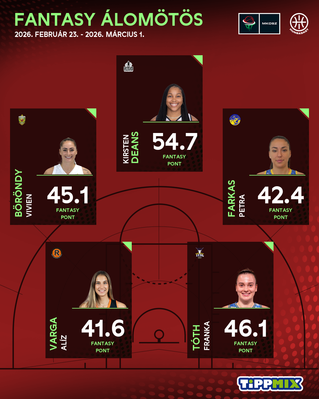 A legjobb produkciót sokadjára Kirsten "KK" Deans hozta a Dávid Kornél Kosárlabda Akadémiától - a BEAC ugyan nyerni tudott Székesfehérváron, de ez legkevésbé Deansen múlott (30 pont, 6 pattanó, 11 gólpassz, 2 szerzett és 5 eladott labda, 54.7 fantasy pont). Mögötte volt egy kisebb űr, hiszen az álomötös többi tagja 50 pont alatt maradt a héten. Tóth Franka volt a második legjobb, aki a TFSE Szekszárd elleni sikeréből vállalt oroszlánrészt (20 pont, 13 lepattanó, 1 gólpassz, 3 blokk, 46.1 fantasy pont).