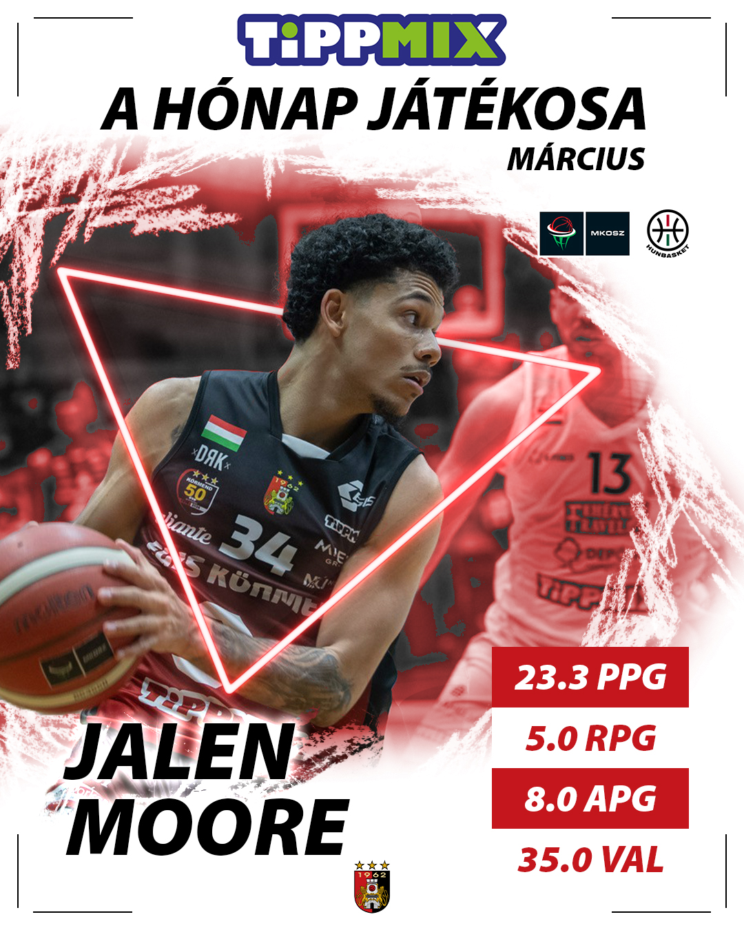 Jalen Moore márciusban MVP szintű teljesítményt nyújtott, és meghatározó szerepet játszott a Körmend sikeres szereplésében. Négy mérkőzésen 3 győzelem mellett összesen 140 VAL-t termelt (35/meccs), miközben 34.5 percet átlagolt.