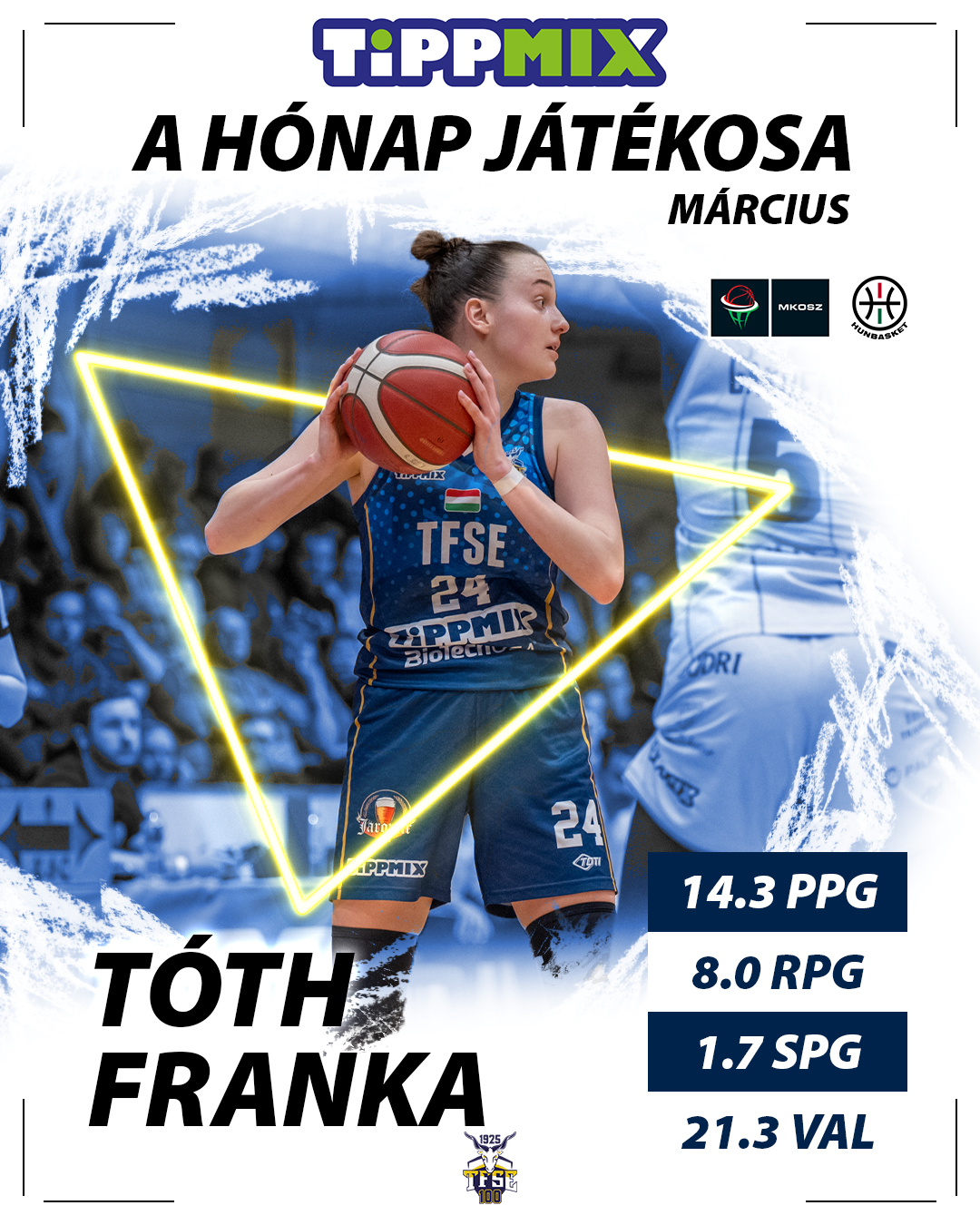 Tóth Franka kiemelkedő hatékonysággal játszott márciusban a rájátszás első körében, és meghatározó szerepet vállalt a TFSE továbbjutásában a TARR KSC Szekszárd ellen. A három mérkőzésen 64 VAL-t (21.3/meccs) termelt, miközben 14.3 pontot átlagolt és közel 36 percet töltött a pályán meccsenként.