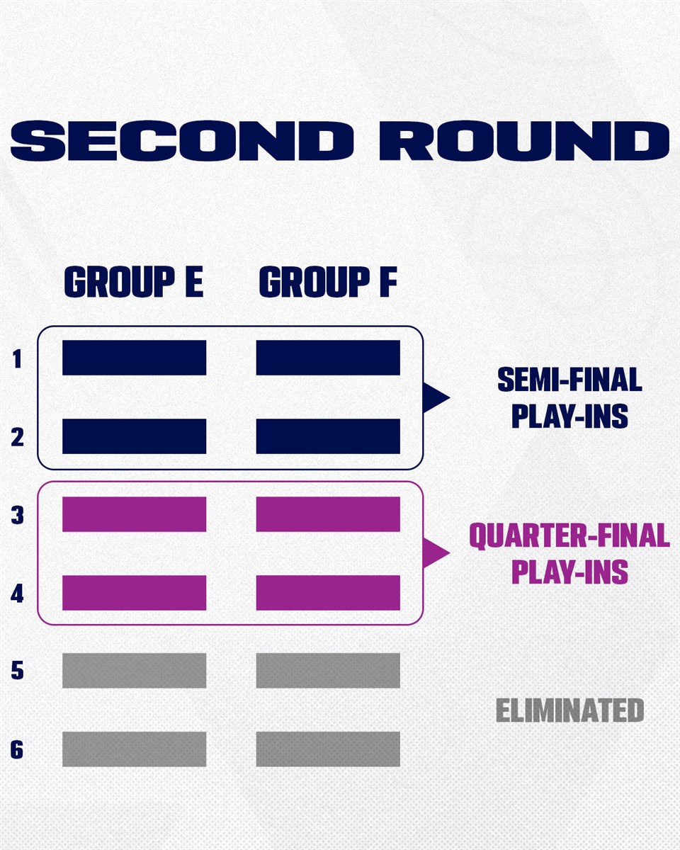 A második csoportkörben két hatosban zajlanak a küzdelmek. Az “A” és a “B”, illetve a “C” és a “D” jelű négyesekből formálódik egy-egy hatos. A csapatok az első körben elért eredményeket viszik magukkal, így itt mindenki csak a szempontjából másik csoportból érkező gárdákkal mérkőzik.