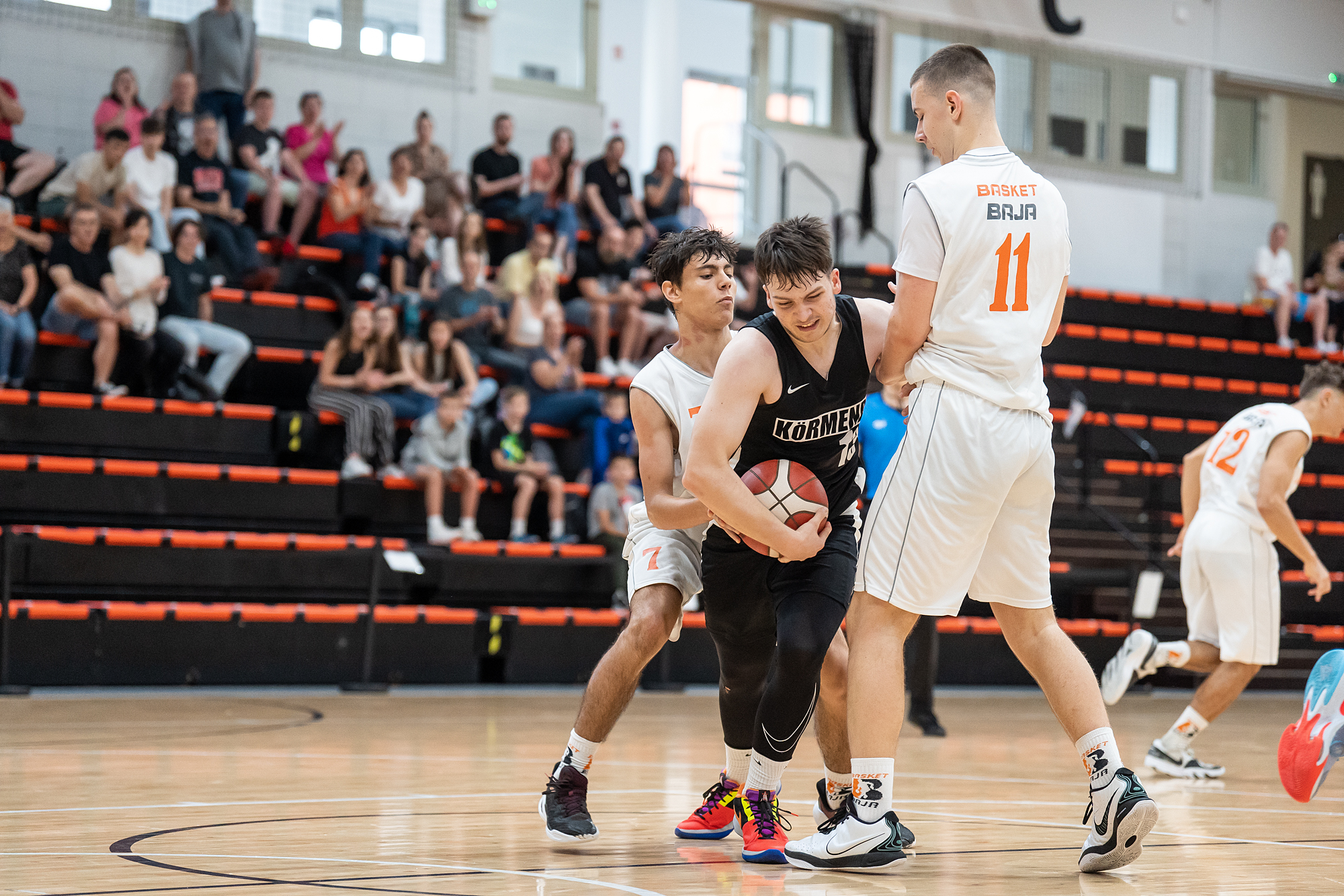 A nap első összecsapásán végig szoros mérkőzést vívott egymással a Bánóczky Bence (18 pont, 10 pattanó, 6 gólpassz), Csorba Levente (24 pont, 12 pattanó) és Hódos Patrik (19 pont, 6-6 pattanó és gólpassz) vezette BASKETBAJA SE/A, illetve a Bartik Zalán (35 pont, 5-5 gólpassz és szerzett labda, 6 eladott labda), Kóbor László (12 pont, 13 pattanó) és Dékány Boján Bendegúz (8-8 pont és pattanó) húzta AKMÉ Körmendi Törpördögök. A negyedik negyedben azért végig a vasiak álltak jobban, akik 3 pontot meg is tartottak előnyükből (70-73).