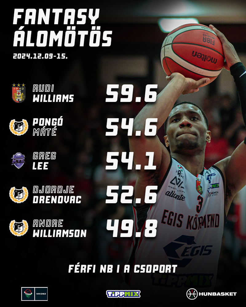 A férfiaknál a DEAC és Duna Aszfalt-DTKH Kecskemét játszottak két-két mérkőzést, ennek megfelelően Pongó Máté (54.6), Greg Lee (54.1), Djordje Drenovac (52.6) és Andre Williamson (52.6) is bekerültek a forduló álömötösébe. Ebben semmi meglepő nincs, de ahogy egy héttel ezelőtt Benke Szilárd, úgy most az Egis Körmend irányítója, Rudi Williams előzött meg mindenkit egyetlen találkozó alatt (59.6).