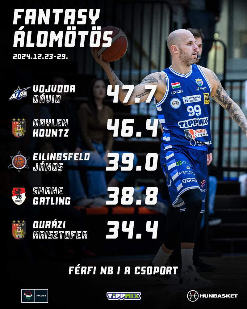 A férfiaknál az Alba-Körmend és az ASE-Honvéd találkozók után Vojvoda Dávid bizonyult a legjobbnak (47.7), Daylen Kountz alig maradt el tőle (46.4). Eilingsfeld János (39.0) volt a legjobb magasember, a Honvéd légiósa, Shane Gatling is befért az álomötösbe (38.8), amibe a Körmend két embert adott, Kountz mellett Durázi Krisztofer is helyet követelt magának teljesítményével (34.4).