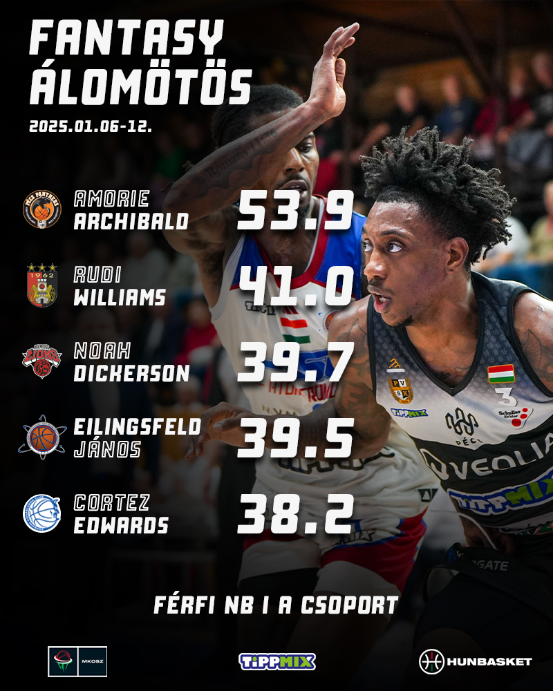 A férfiaknál Amorie Archibald (53.9) messze kiemelkedett ezen a héten, majdnem 13 pontot vert a második legjobb Rudi Williamsre (41.0), Williamstől kezdve viszont nagyon szoros volt a mezőny: Noah Dickerson (39.7), Eilingsfeld János (39.5) és Cortez Edwards (38.2) fértek még be a Top5-be és ezzel az álomcsapatba.