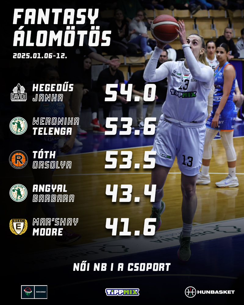 A hölgyeknél a DKKA játékosa, Hegedűs Janka hozta a legjobb mutatót (54.0), de Weronika Telenga (53.6) és Tóth Orsolya (53.5) is szinte ugyanilyen teljesítményt hozott. Az álomötös Angyal Barbarával (43.4) és Mar'Shay Moore-ral (41.6) lett teljes.