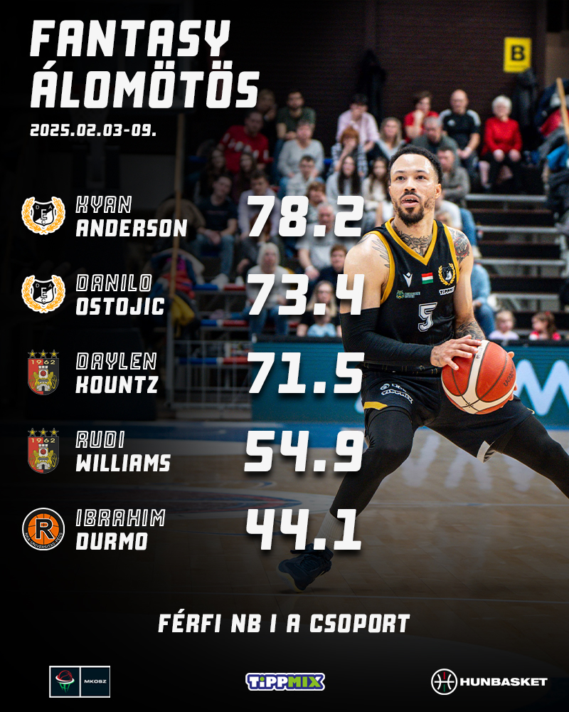 A negyedik Kountz csapattársa, az előbb említett Rudi Williams lett (54.9), aki tartja fantasztikus formáját - most épp csak egy kicsit a háttérbe szorult a másik körmendi amerikai parádés teljesítménye miatt. Az álomötös ötödik tagjához viszont egészen a 12. helyig kell lepörgetni. Cortez Edwards (52.4) a posztok, Pongó Máté (50.9) és Mócsán Bálint (49.4) a posztok és a csapat, Andre Williamson (47.3) a csapat, Kaelin Jackson (46.4), Amorie Archibald (44.9) és Jay Jay Chandler (44.5) pedig újfent a posztok miatt nem kerülhetett be - így lett végül Ibrahim Durmo (44.1) az ötödik befutó.