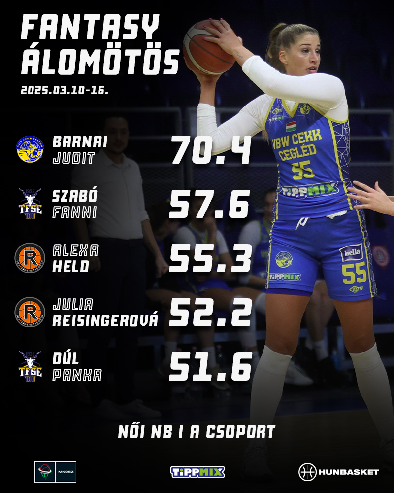 A hölgyeknél is voltak duplázók a héten, a TFSE-MTK és az NKA Universitas Pécs játékosai. Szabó Fanni (57.6), Alexa Held (55.3), Julia Reisingerová (52.2) és a hatodik helyen záró Dúl Panka (51.6) be is kerültek - Studer Ágnes (51.9) az ötödik helyen harmadik NKA-sként nem jutott be ezúttal. A legjobb azonban mindenkit megelőzve Barnai Judit lett (70.4), aki parádés formában zárta az alapszakaszt, és végül Ashten Prechtel mögött a második legtöbb pontot gyűjtötte a fantasy-ben.