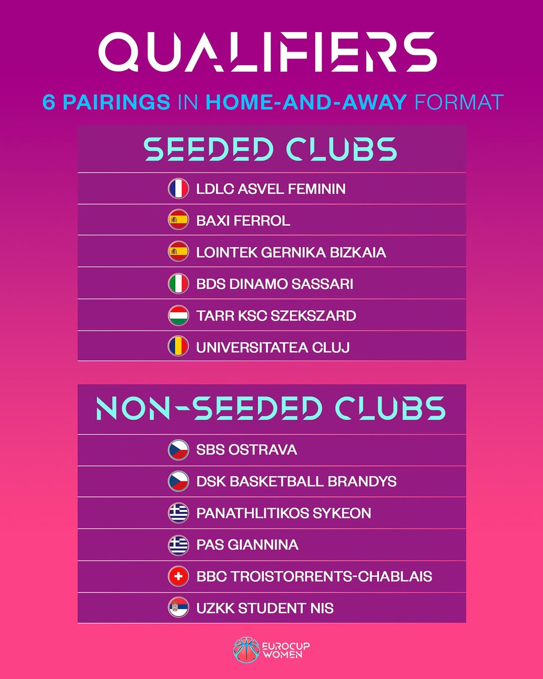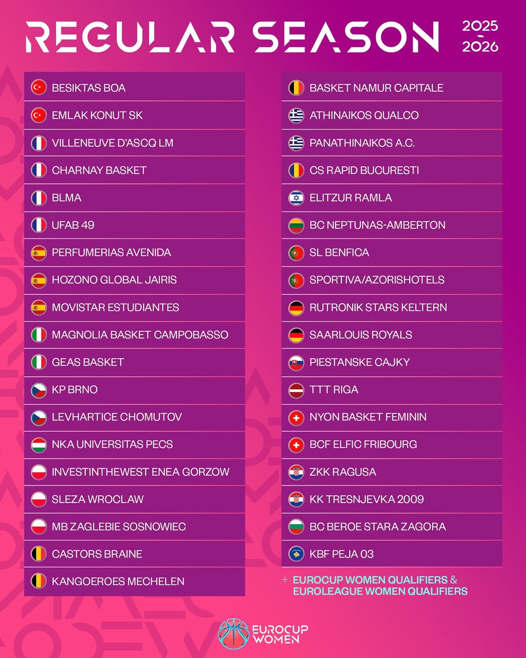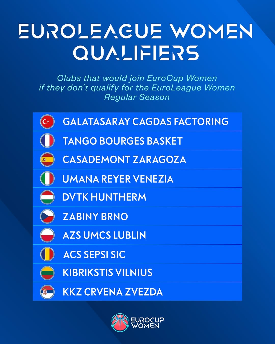 Euroliga-selejtező vesztese 1, Euroliga-selejtező vesztese 2, Euroliga-selejtező vesztese 3, Euroliga-selejtező vesztes 4, Euroliga-selejtező vesztese 5, Besiktas Boa (TUR), Emlak Konut (TUR), Villeneuve d’Ascq LM (FRA), Charnay Basket (FRA), BLMA (FRA), UFAB 49 (FRA), Perfumerías Avenida (ESP), Hozono Global Jairis (ESP), Movistar Estudiantes (ESP), Magnolia Basket Campobasso (ITA), GEAS Basket (ITA), KP Brno (CZE), Levhartice Chomutov (CZE), NKA Universitas Pécs (HUN), InvestInTheWest Enea Gorzow (POL), Sleza Wroclaw (POL), MB Zaglebie Sosnowiec (POL), Castors Braine (BEL), Kangoeroes Mechelen (BEL), Basket Namur Capitale (BEL), Athinaikos Qualco (GRE), Panathinaikos A.C. (GRE), CS Rapid Bucuresti (ROU), Elitzur Ramla (ISR), BC Neptunas-Amberton (LTU), SL Benfica (POR), Sportiva/AzorisHotels (POR), Rutronik Stars Keltern (GER), Saarlouis Royals (GER), Piestanske Cajky (SVK), TTT Riga (LAT), Nyon Basket Feminin (SUI), BCF Elfic Fribourg (SUI), ZKK Ragusa (CRO), KK Tresnjevka 2009 (CRO), BC Beroe Stara Zagora (BUL), KBF Peja 03 (KOS)