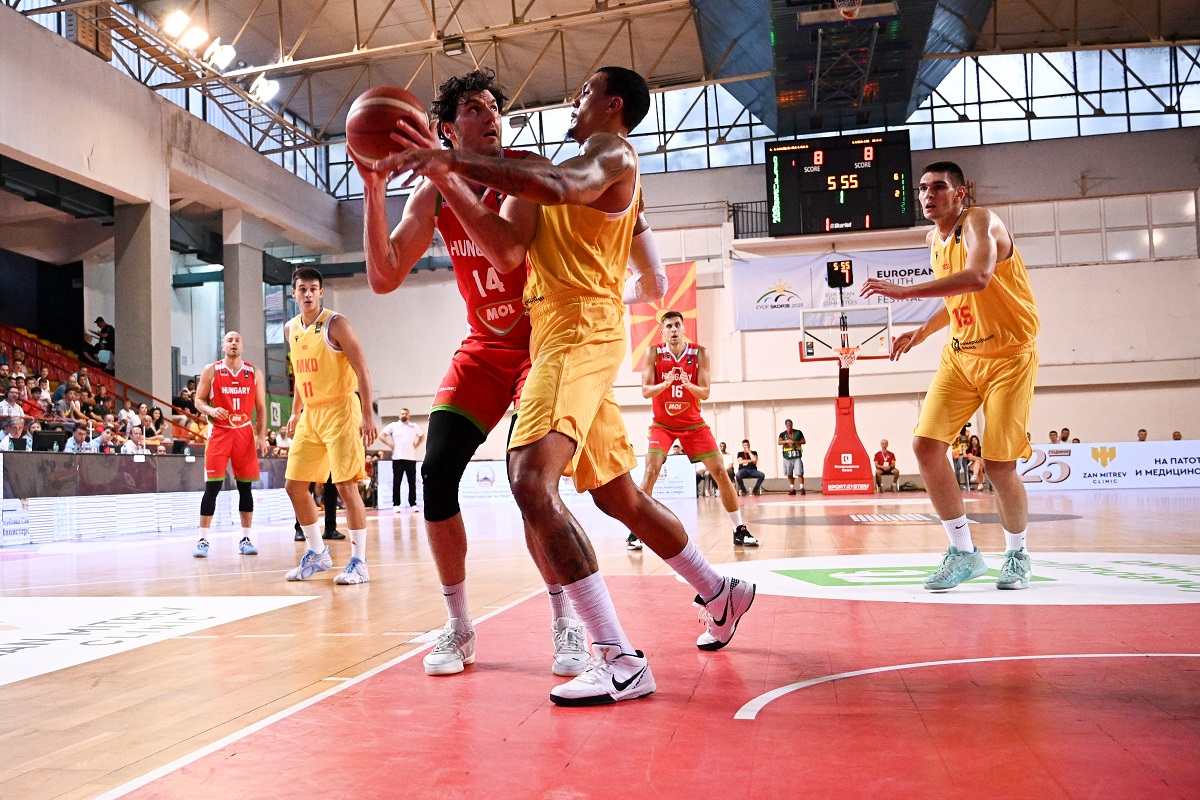 A feldobás után rögtön Wiley zsákolt két kézzel nagyot, a mi első kosarunkat Golomán jegyezte, majd a macedónok honosított játékosa egy tempót is bedobott - írja a bb1. Váradi szorított helyzetből vágta be a triplát, a hazaiaknál továbbra is Wiley felelt a pontokért, majd megint Váradi köszönt be kintről (6-8). Stojanovski tette fel bátran a ziccert Golomán szorításában, Simikj tett vissza egy támadólepattanót, Benke ment be a sűrűjébe, Wiley dobta át emberét. Pongó talált be távolról, Golomán fejezett be egy gyorsindítást, Észak-Macedónia pedig időt kért bő hat perc elteltével (12-15). Tashovski dobta be a büntetőket, Mitrevski hármasával pedig már az ellenfélnél volt az előny, Tashovski büntetett meg egy eladott labdát (19-15). Kakruki és Tashovski gyors kosaraival nyolc ponttal meglépett Észak-Macedónia az első 10 perc végére. 23-15