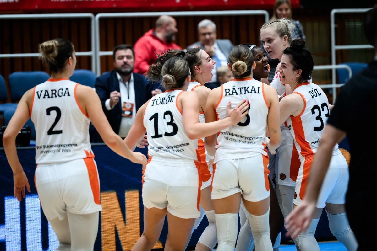 NKA Universitas Pécs: Varga A. 8/6, Rátkai 1, Török 6/3, Dúl P. 7/3, Reisingerová 22. Csere: Studer 8/3, Olawuyi 4, Josepovits -, Tóth O. 6.