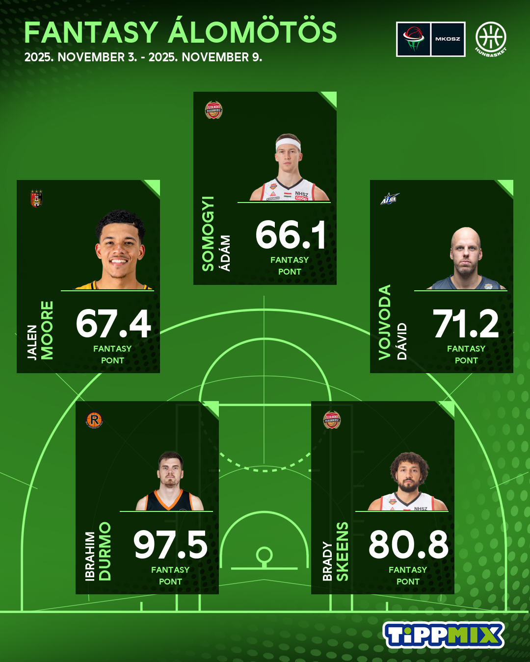 A hátvédek közül Vojvoda Dávid volt a legjobb - az Alba Fehérvár válogatott kiválósága a Körmend ellen játszotta 600. NB I-es mérkőzését, és 71.2 ponttal a legjobb backcourt játékos volt a héten. A körmendiektől is van egy játékos az álomötösben, Jalen Moore, aki 67.4 fantasy pontot hozott az Alba és előtte a Honvéd ellen.