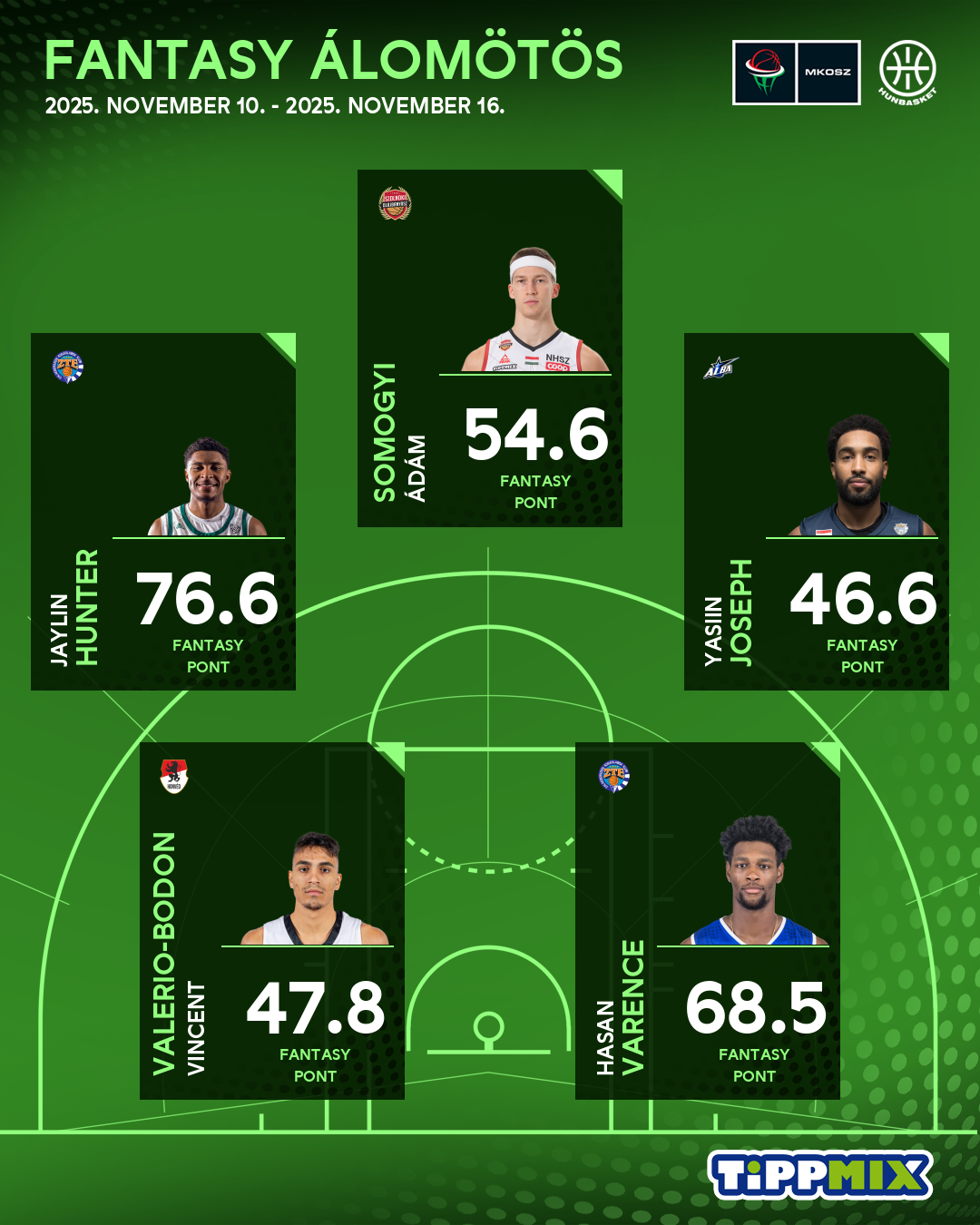 Szintén duplázott a héten Valerio-Bodon Vincent (47.8 fp), aki a ZTE ellen csak 14.9 fantasy pontig jutott, a Falco ellen viszont nagyon sokoldalú volt (15 pont, 2 lepattanó, 5 gólpassz, 3 szerzett labda (4 eladott), 1 blokk). Az álomcsapat utolsó tagja pedig Yasiin Joseph, aki a legjobb meccsét hozta az Alba színeiben a ZTE ellen (14 pont, 3 lepattanó, 10 gólpassz, 4 szerzett és 1 eladott labda, 1 blokk, 46.6 fantasy pont).