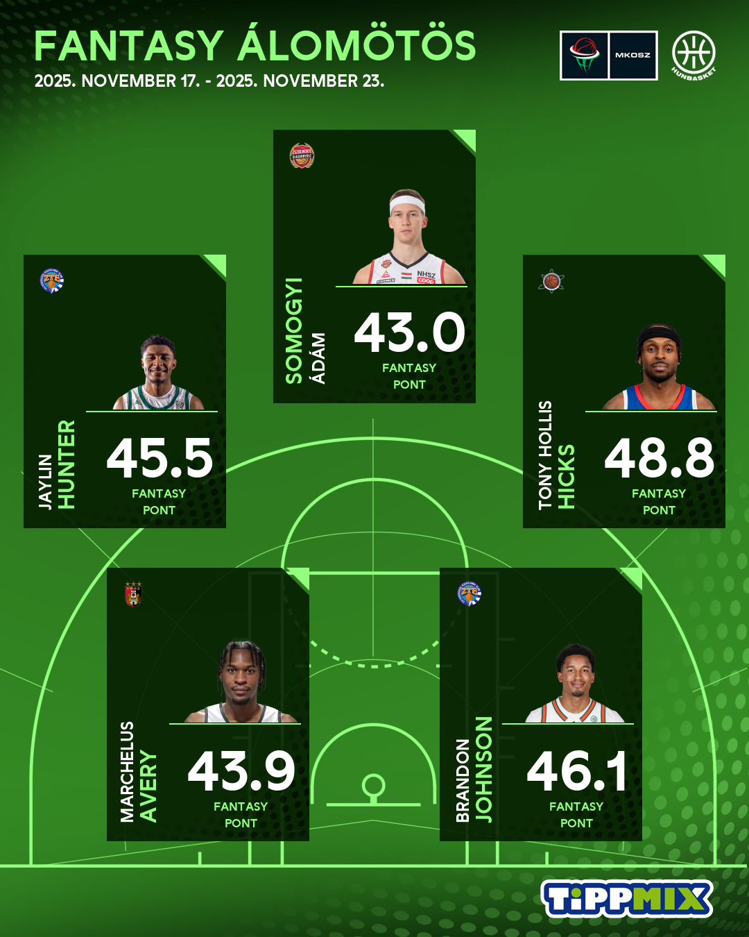 Fantasy szempontból szinte ugyanilyen teljesítmény nyújtott csapattársa, Jaylin Hunter, aki 11 pontot és ugyanennyi gólpasszt, 5-5 lepattanót és szerzett labdát, valamint 3 eladott labdát hozott össze 45.5 fantasy pontért. A túloldal, a Körmend legjobbja is bekerült a heti álomötösbe: Marchelus Avery 25 ponttal, 7 lepattanóval, 1-1 gólpasszal és blokkal, illetve 2 szerzett labdával vezette övéit (43.9 fp). A listavezető Szolnoknál pedig a múlt héten is Somogyi Ádám vitte a prímet: a válogatott irányítója 21 ponttal, 12 gólpasszal, valamint 2-2 szerzett és eladott labdával zárt (43.0 fp).