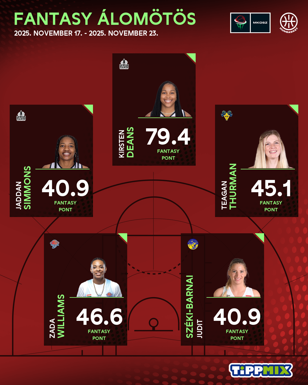 A Székesfehérváron vereséget szenvedő BKG-nál Teagan Thurman produkálta a legjobb fantasy teljesítményt (45.1 fp). A szigetszentmiklósiak egyik vezére 26 pontig, 13 lepattanóig, 1 gólpasszig, illetve 3 szerzett labdáig jutott - 7 eladott labdájával együtt is 45 fantasy pont fölött zárt. Az álomötös 4. és 5. helyén pedig holtverseny volt 40.9 fantasy ponttal: ennyit ért el Széki-Barnai Judit a Győr elleni vereség során (14 pont, 12 lepattanó, 3 gólpassz, 1 blokk, 2 szerzett és 1 eladott labda), és ennyi került Deans csapattársa, Jaddan Simmons neve mellé is (17 pont, 7 lepattanó, 5 gólpassz, 3 szerzett és 1 eladott labda).