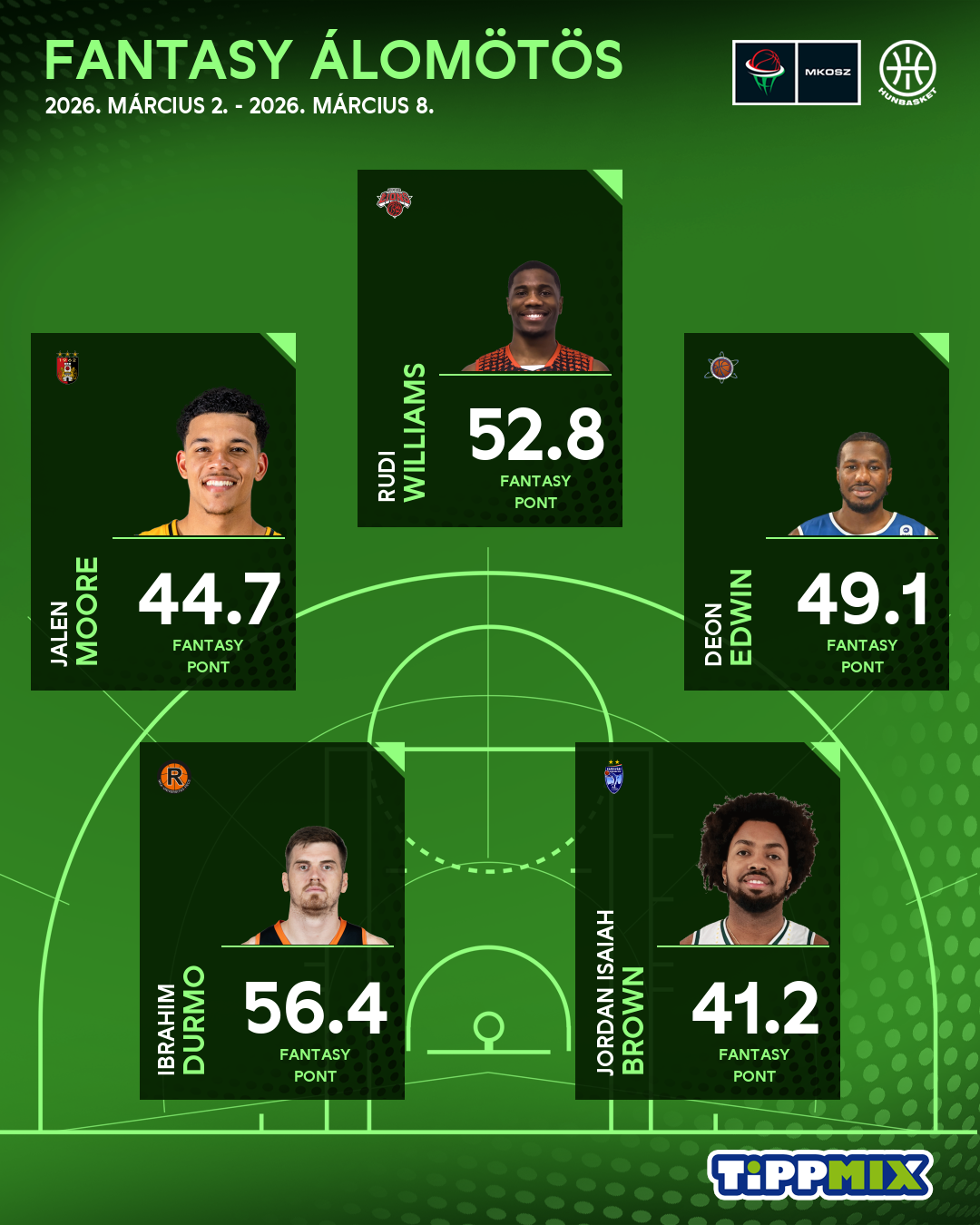 Mögötte a posztok miatt nem került az álomcsapatba Pongó Marcell (43.5 fp), illetve Trevon Bluiett (41.4 fp). Így kapott helyet az álomötösben a kaposvári Jordan Brown, aki nagyon sokoldalú volt az OSE elleni győzelem alkalmával (18 pont, 6 pattanó, 2-2 gólpassz és blokk, 3 szerzett és 2 eladott labda, 41.2 fantasy pont).